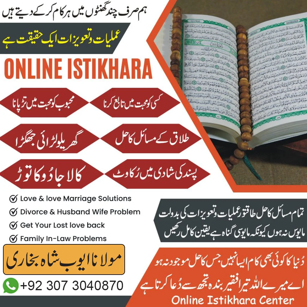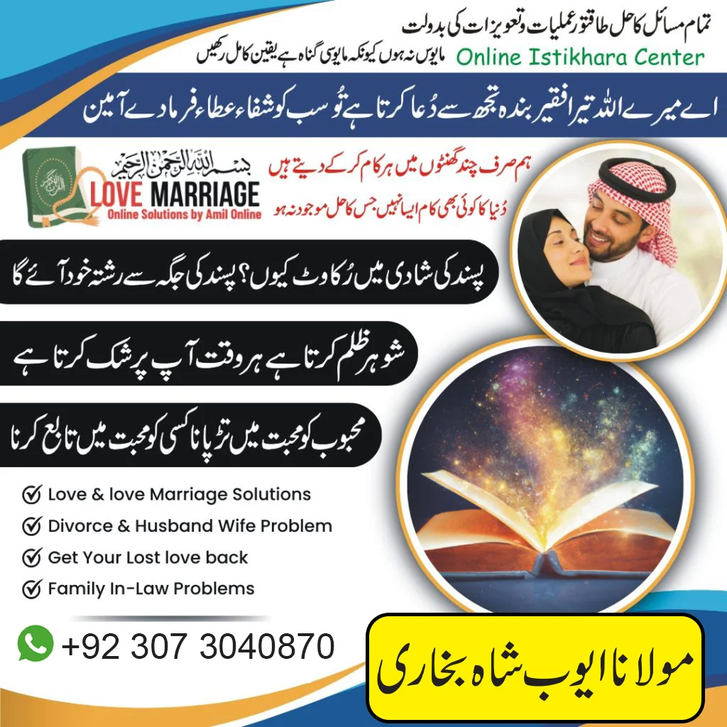 If you are facing challenges in love marriage due to family pressure, misunderstandings, or delays, seek guidance from Molana Ayub Shah Bukhari, a trusted spiritual advisor who understands your situation. Through Istikhara and faith-based advice, you can find a calm and respectful path forward. So contact now anytime on phone.